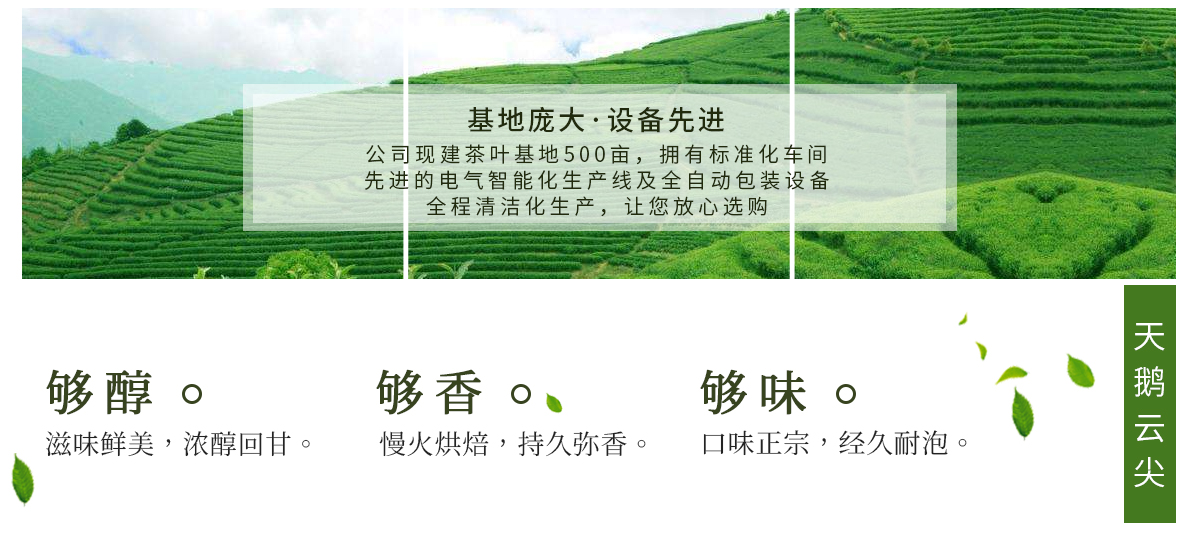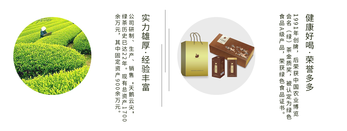 - 安徽天鵝茶業(yè)有限責(zé)任公司研制、生產(chǎn)、銷售“天鵝云尖”名綠茶歷史已達(dá)22年。現(xiàn)有總資產(chǎn)1700余萬元,其中固定資產(chǎn)900余萬元。公司現(xiàn)建茶葉基地500余畝,基地常年云霧繚繞。并擁有標(biāo)準(zhǔn)化車間、先進(jìn)的電氣智能化生產(chǎn)線及全自動(dòng)包裝設(shè)備,全程清潔化生產(chǎn)。公司在社會(huì)各界的關(guān)注幫助及員工的努力下,獲得了安徽省茶葉行業(yè)協(xié)會(huì)常務(wù)理事單位。“天鵝茶業(yè)”由安徽省農(nóng)業(yè)大學(xué)楊維時(shí)教授指導(dǎo)創(chuàng)制,并受到當(dāng)代茶圣陳椽教授的指點(diǎn)和親筆題名。1991年創(chuàng)牌,后榮獲中國農(nóng)業(yè)博覽會(huì)名(綠)茶金質(zhì)獎(jiǎng)。 公司依托天潤茶業(yè)專業(yè)合作社建立緊密型茶園基地,以“客...